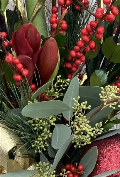 What more could you want, this striking vase arrangement is the perfect gift as its filled with a selection of festivities that include amaryllis, ilex, berries, salix, seasonal foliages, presented with a gillter box and bauble.