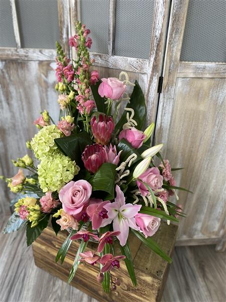 you have snapdragons, double eustoma, lilies,mondail roses, tropic proteas & orchids all with a mixture of luxury foliage's to compliment these lovely flowers