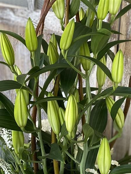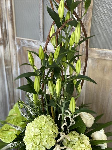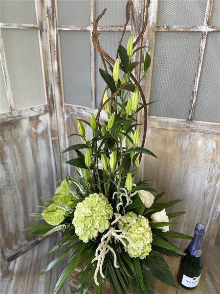 created with salix hydrangea roses lilies anthuriums Veronica and tropical foliage